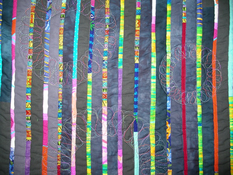 Dies ist mein Quilt und meine Gedanken dazu waren die folgenden: Mit diesem Quilt will ich den Schmerz und die Wut ausdrücken, aber zugleich auch aufzeigen, dass es immer wieder weiter geht und wieder bessere Zeiten kommen, in welche aber bestimmt auch ab und zu Wut und Schmerz zugelassen werden muss.