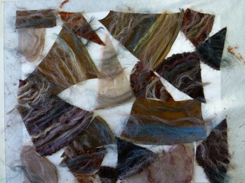um die Farben etwas zu dämpfen, habe ich Seidenvlies und Strickgarne zerzupft aufgelegt